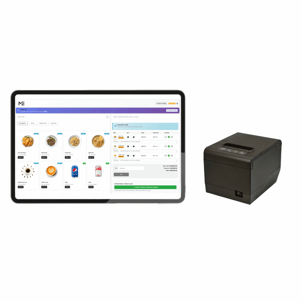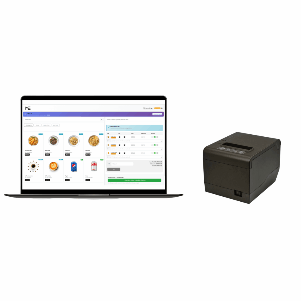 A complete plug-and-play POS bundle—tablet, thermal printer, and MePOS system included. Ready to use out of the box.
