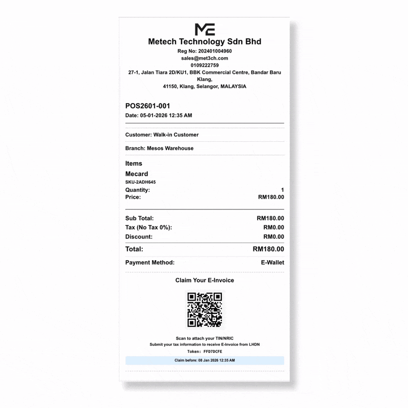 Automatically generate and print LHDN-compliant e-Invoices. Each receipt includes a QR code so your customers can easily claim their invoice directly from MyInvois.